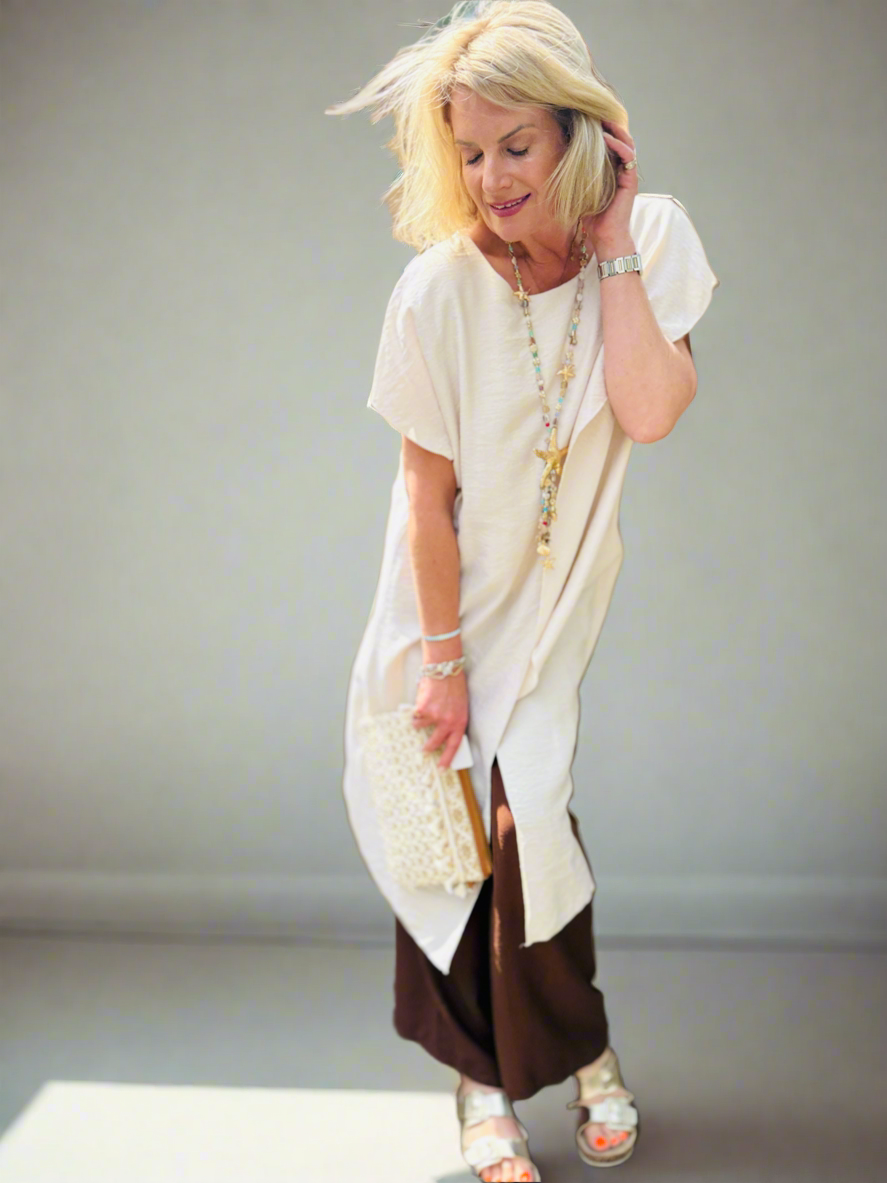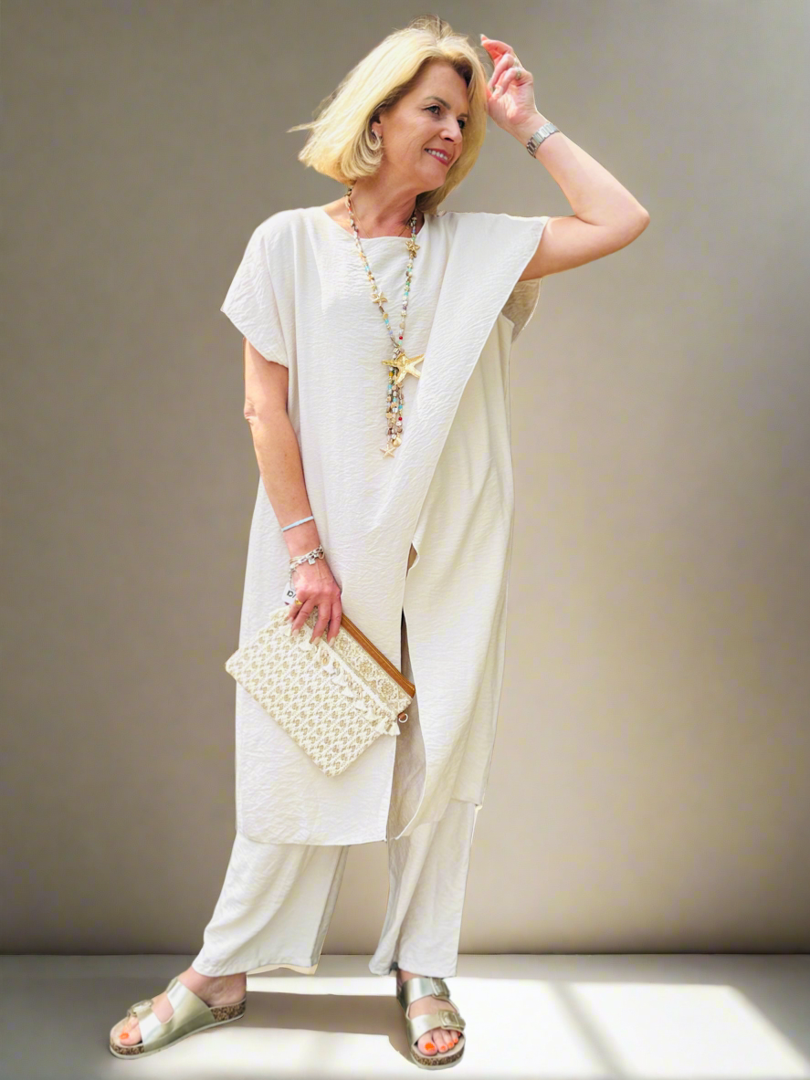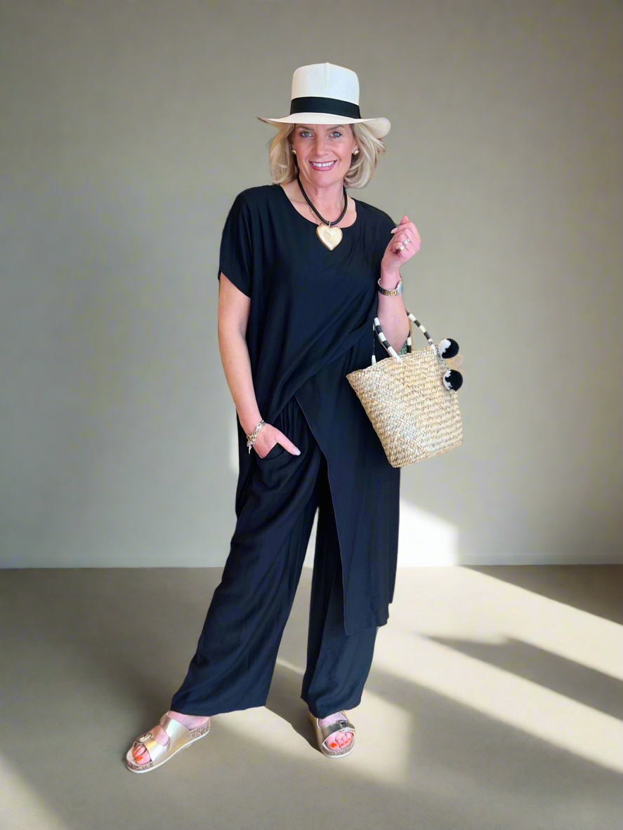 This gorgeous two-piece laagenlook co-ord is all about effortless style and versatility. The long, fluid lines of the asymmetric top create a flattering silhouette that really makes an impact, while the matching straight-leg trousers keep the look relaxed and easy to wear.